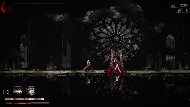 The game has rather simple pixel art graphics, mostly black and white with pinches of red. The graphics lack detail—it's like an oil painting turned into pixels.